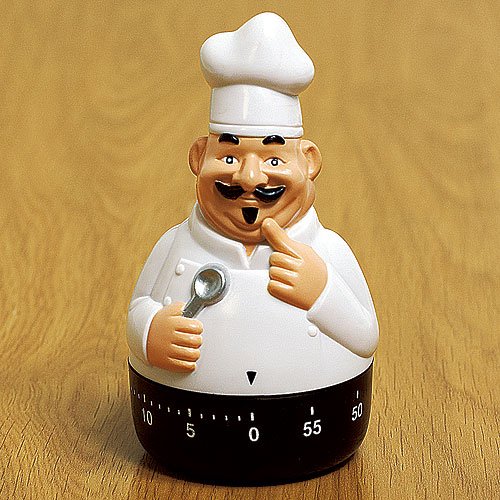 Ensure your food cooks to perfection with this handy kitchen timer This friendly fellow will really help you out in the kitchen. If you are cooking several dishes at once or need to check on an item as it cooks, the Chef Kitchen Timer will never let you down. Simply set your time # the kitchen timer counts down from anything between one minute to one hour # and wait for the bell to ring. This charming timer gives you the freedom to relax or get on with something else as your food cooks perfectly. A great little gadget to have on display at all times. Measures 8cm (3 1/4) high.